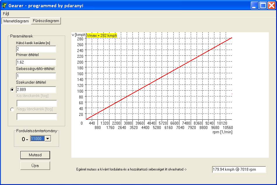 A főtengely fordulatszáma. Ezt az adatot a legkönnyebb bevinni, még írni sem kell, egyszerűen a gördítősávban kiválasztom a fordulatot amit akarok. A legegyszerűbbnek tűnt számomra a következő sorrend: kerék kerülete, primer áttétel, sebességváltó áttétel, szekunder áttétel, fordulatszám kiválasztása. Ha a váltó minden fokozatát egyszerre akarom látni a diagramon, akkor sorban írom be a sebességek adatait, pl. beírom az egyes fokozat áttételét elsőként, fordulatválasztás és megvan az első egyenes a diagramban. Most az egyes helyére beírom a kettes fokozat áttételi arányát és a „mutasd” ablakra klikkelek. A többi fokozat ugyanígy. Ha az „újra” ablakra klikkelek, csak az utoljára bevitt adatot hagyja a táblán, a többit törli.