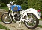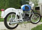 A motort aztán teljesen szétszedtem, mindent homokfúvattam. A váz és az apróbb alkatrészek műanyag bevonatot kaptak, csak a láncburkolat a sárhányók és a tank lett fényezve. A tank rendőrkékre, más minden fehérre. Két új felnit kellett venni, amit aztán saját kezűleg befűztem új küllőkkel, de a régi anyákkal, az új anyákat egyszerűen drágának találtam. Így is új gumival 15000 forintomba került egy-egy kerék. A fékpofákat újra ferrodoloztattam, majd becsiszoltam úgy, hogy a fékpofa felületének legalább 90 százaléka fogjon. A krómos lámpafejet kicseréltem a frissen festettre, a többi krómos alkatrész maradt, bár használtak, de még jó állapotúak.